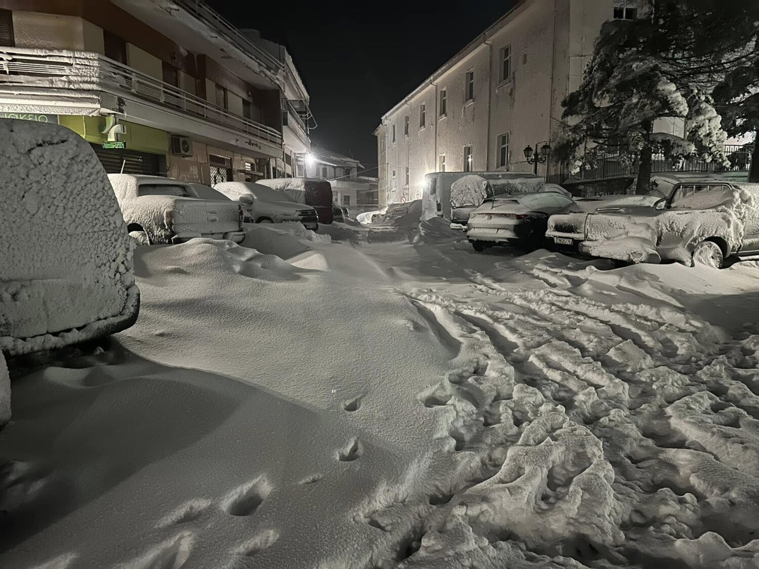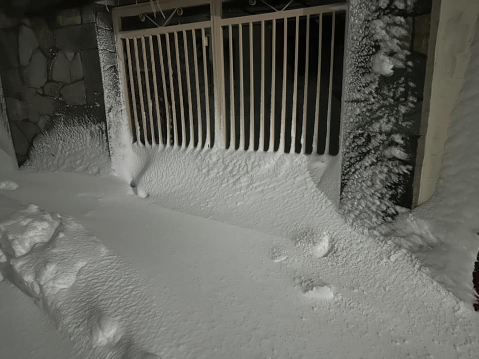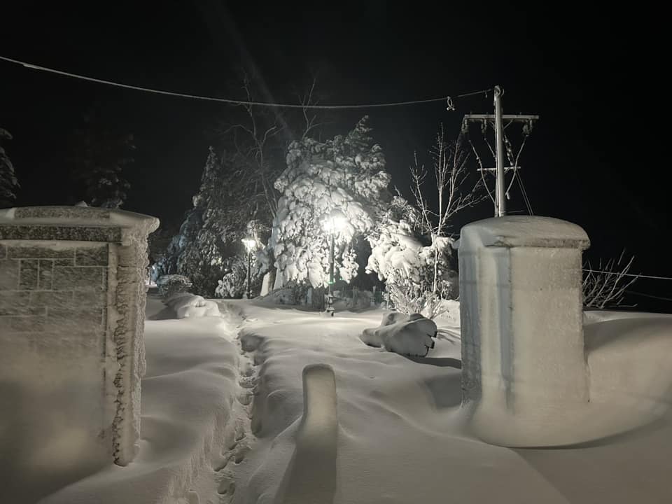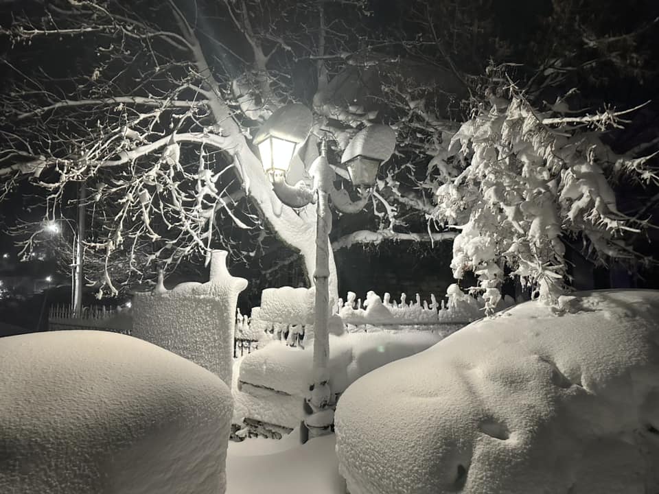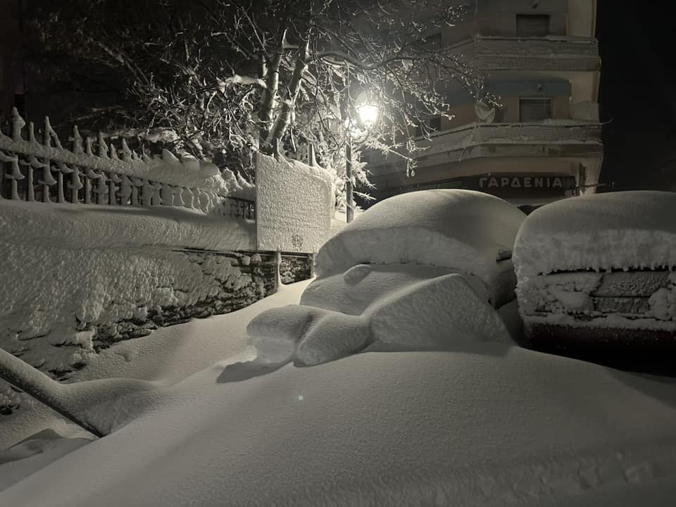 Τα κλαδιά των δέντρων έχουν πέσει προς το έδαφος από το βάρος, ενώ αυτοκίνητα και αυλές καλύπτονται από το λευκό πέπλο.