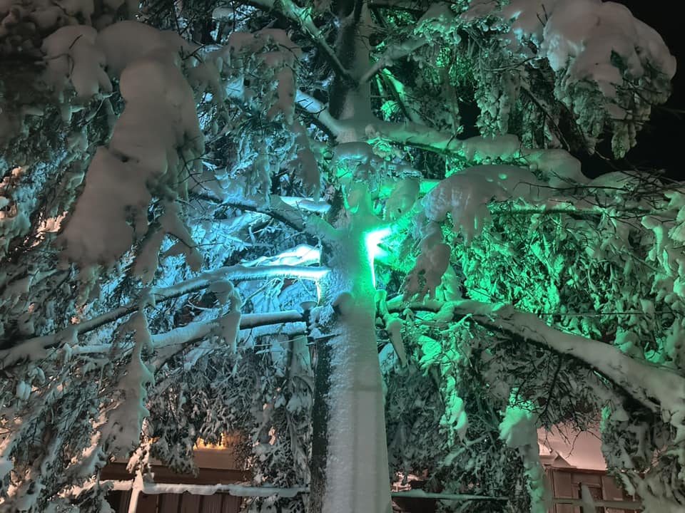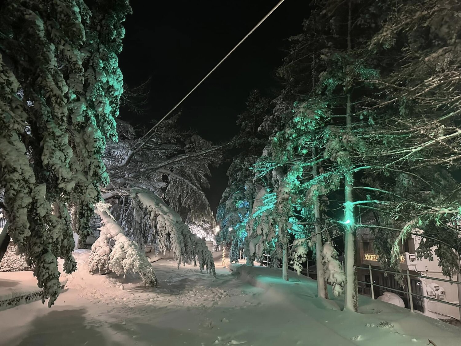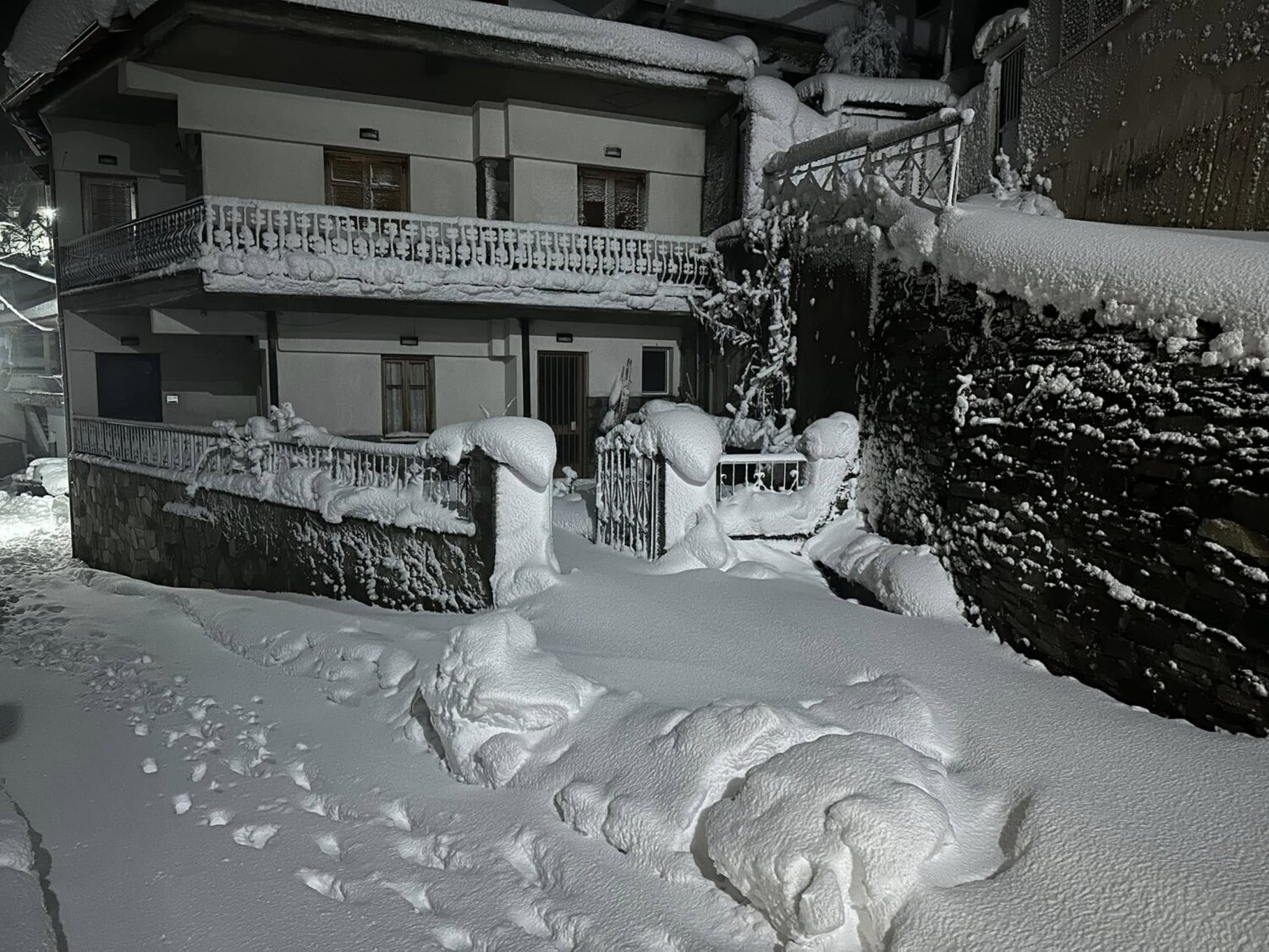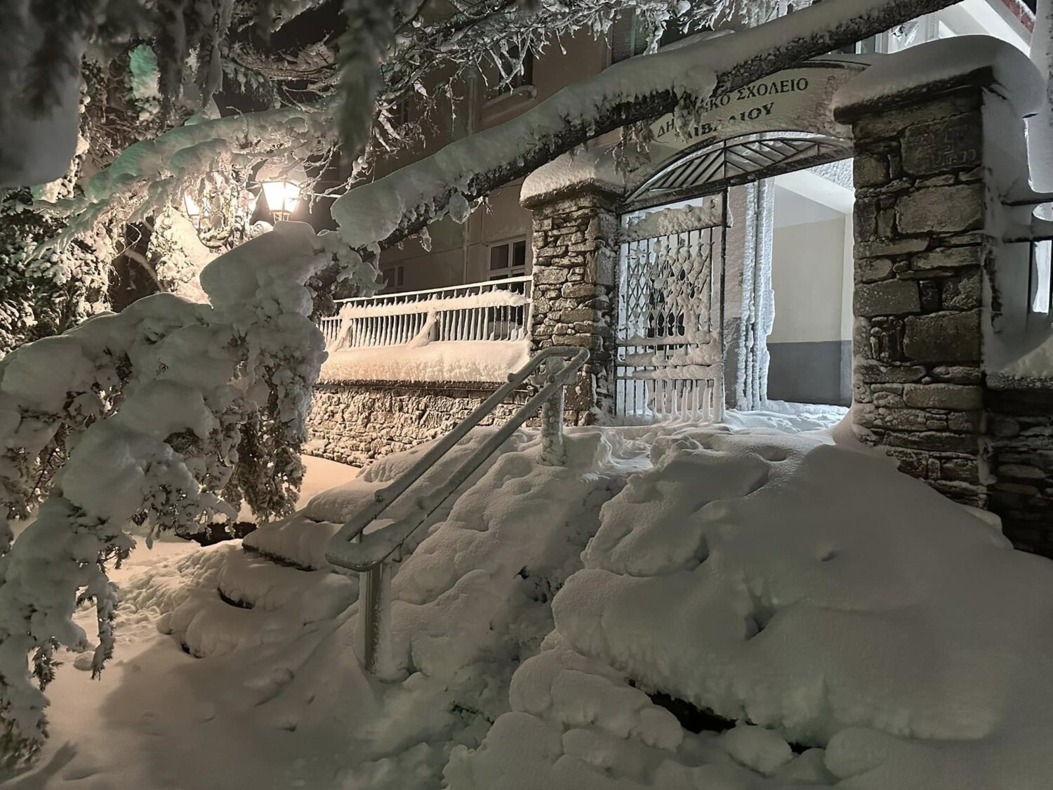 Τα κλαδιά των δέντρων έχουν πέσει προς το έδαφος από το βάρος, ενώ αυτοκίνητα και αυλές καλύπτονται από το λευκό πέπλο.